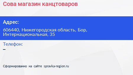 Сова, магазин канцтоваров по адресу 606440, Нижегородская область, Бор, Интернациональная, 35 в дальнейшем Организация, размещена в следующих категориях: