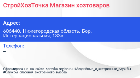 СтройХозТочка, Магазин хозтоваров по адресу 606440, Нижегородская область, Бор, Интернациональная, 133в в дальнейшем Организация, размещена в следующих категориях: