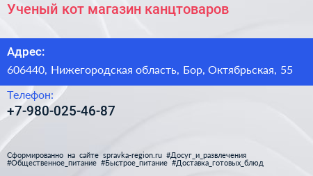 Ученый кот, магазин канцтоваров по адресу 606440, Нижегородская область, Бор, Октябрьская, 55 в дальнейшем Организация, размещена в следующих категориях: