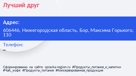 Лучший друг по адресу 606446, Нижегородская область, Бор, Максима Горького, 110 в дальнейшем Организация, размещена в следующих категориях: