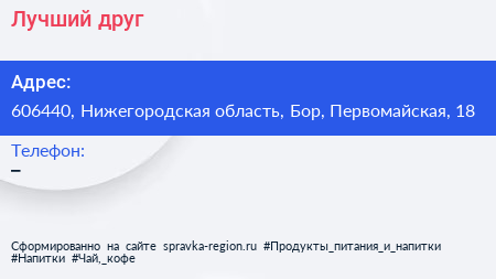 Лучший друг по адресу 606440, Нижегородская область, Бор, Первомайская, 18 в дальнейшем Организация, размещена в следующих категориях: