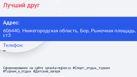 Лучший друг по адресу 606440, Нижегородская область, Бор, Рыночная площадь, ст3 в дальнейшем Организация, размещена в следующих категориях: