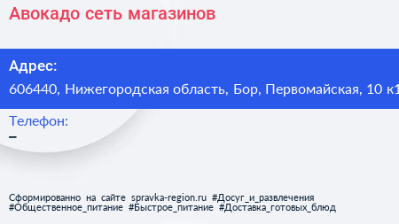 Авокадо, сеть магазинов по адресу 606440, Нижегородская область, Бор, Первомайская, 10 к1 в дальнейшем Организация, размещена в следующих категориях: