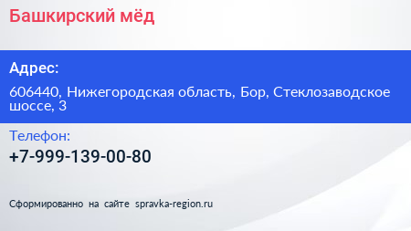Башкирский мёд по адресу 606440, Нижегородская область, Бор, Стеклозаводское шоссе, 3 в дальнейшем Организация, размещена в следующих категориях:
