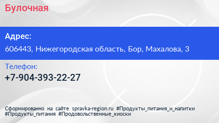 Булочная по адресу 606443, Нижегородская область, Бор, Махалова, 3 в дальнейшем Организация, размещена в следующих категориях: