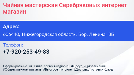 Чайная мастерская Серебряковых, интернет-магазин по адресу 606440, Нижегородская область, Бор, Ленина, 3Б в дальнейшем Организация, размещена в следующих категориях: