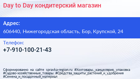 Day to Day, кондитерский магазин по адресу 606440, Нижегородская область, Бор, Крупской, 24 в дальнейшем Организация, размещена в следующих категориях: