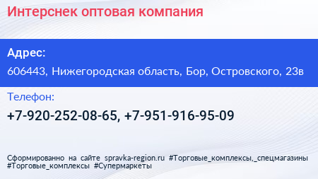 Интерснек, оптовая компания по адресу 606443, Нижегородская область, Бор, Островского, 23в в дальнейшем Организация, размещена в следующих категориях: