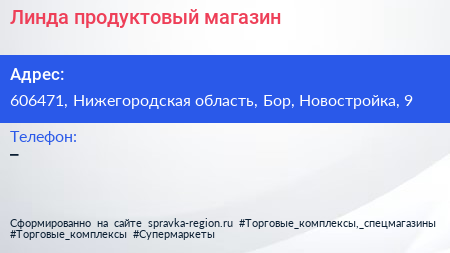 Линда, продуктовый магазин по адресу 606471, Нижегородская область, Бор, Новостройка, 9 в дальнейшем Организация, размещена в следующих категориях: