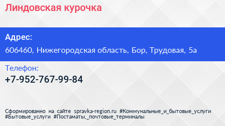 Линдовская курочка по адресу 606460, Нижегородская область, Бор, Трудовая, 5а в дальнейшем Организация, размещена в следующих категориях: