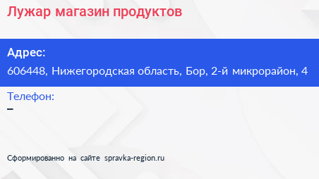 Лужар, магазин продуктов по адресу 606448, Нижегородская область, Бор, 2-й микрорайон, 4 в дальнейшем Организация, размещена в следующих категориях: