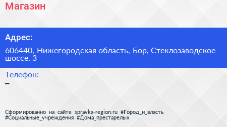 Магазин по адресу 606440, Нижегородская область, Бор, Стеклозаводское шоссе, 3 в дальнейшем Организация, размещена в следующих категориях: