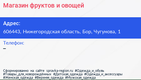 Магазин фруктов и овощей по адресу 606443, Нижегородская область, Бор, Чугунова, 1 в дальнейшем Организация, размещена в следующих категориях: