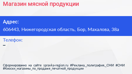 Магазин мясной продукции по адресу 606443, Нижегородская область, Бор, Махалова, 38а в дальнейшем Организация, размещена в следующих категориях: