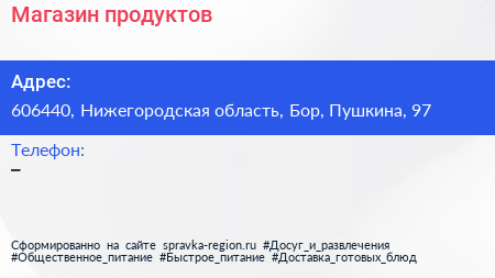 Магазин продуктов по адресу 606440, Нижегородская область, Бор, Пушкина, 97 в дальнейшем Организация, размещена в следующих категориях: