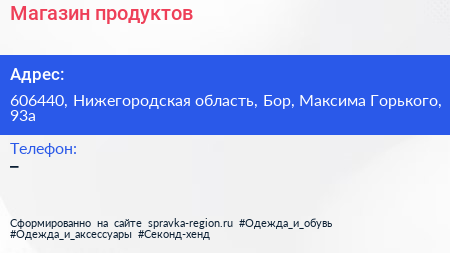Магазин продуктов по адресу 606440, Нижегородская область, Бор, Максима Горького, 93а в дальнейшем Организация, размещена в следующих категориях: