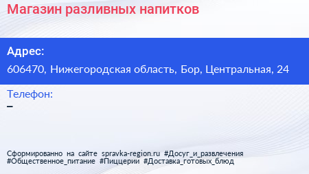 Магазин разливных напитков по адресу 606470, Нижегородская область, Бор, Центральная, 24 в дальнейшем Организация, размещена в следующих категориях: