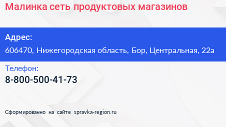 Малинка, сеть продуктовых магазинов по адресу 606470, Нижегородская область, Бор, Центральная, 22а в дальнейшем Организация, размещена в следующих категориях: