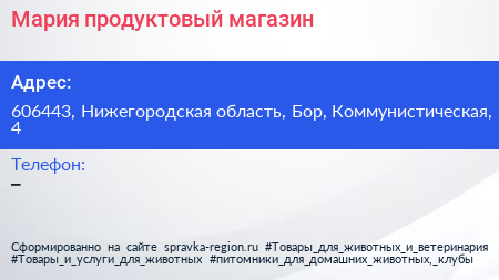 Мария, продуктовый магазин по адресу 606443, Нижегородская область, Бор, Коммунистическая, 4 в дальнейшем Организация, размещена в следующих категориях: