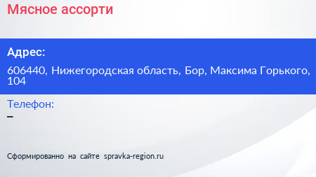 Мясное ассорти по адресу 606440, Нижегородская область, Бор, Максима Горького, 104 в дальнейшем Организация, размещена в следующих категориях: