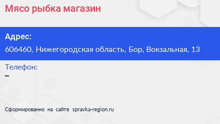Мясо & рыбка, магазин по адресу 606460, Нижегородская область, Бор, Вокзальная, 13 в дальнейшем Организация, размещена в следующих категориях: