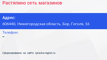 Растяпино, сеть магазинов по адресу 606440, Нижегородская область, Бор, Гоголя, 16 в дальнейшем Организация, размещена в следующих категориях: