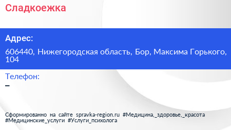 Сладкоежка по адресу 606440, Нижегородская область, Бор, Максима Горького, 104 в дальнейшем Организация, размещена в следующих категориях: