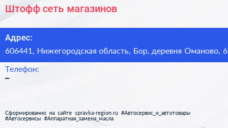Штофф, сеть магазинов по адресу 606441, Нижегородская область, Бор, деревня Оманово, 6 в дальнейшем Организация, размещена в следующих категориях: