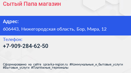 Сытый Папа, магазин по адресу 606443, Нижегородская область, Бор, Мира, 12 в дальнейшем Организация, размещена в следующих категориях: