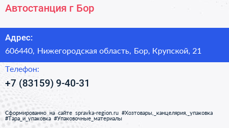 Автостанция г. Бор по адресу 606440, Нижегородская область, Бор, Крупской, 21 в дальнейшем Организация, размещена в следующих категориях: