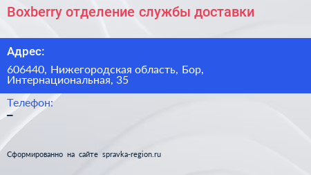 Boxberry, отделение службы доставки по адресу 606440, Нижегородская область, Бор, Интернациональная, 35 в дальнейшем Организация, размещена в следующих категориях: