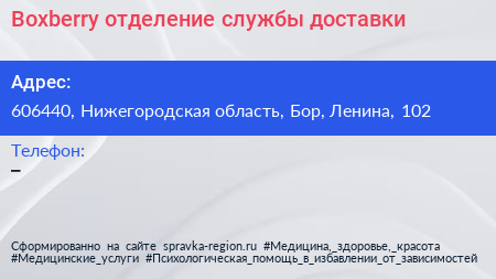 Boxberry, отделение службы доставки по адресу 606440, Нижегородская область, Бор, Ленина, 102 в дальнейшем Организация, размещена в следующих категориях: