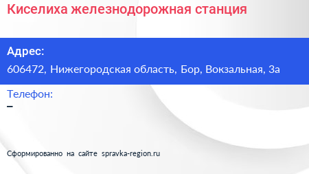 Киселиха, железнодорожная станция по адресу 606472, Нижегородская область, Бор, Вокзальная, 3а в дальнейшем Организация, размещена в следующих категориях:
