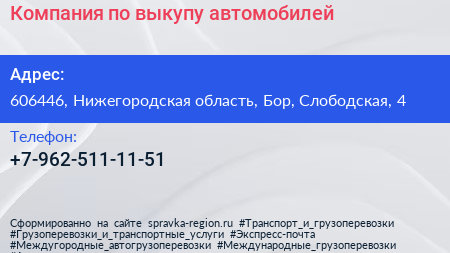 Компания по выкупу автомобилей по адресу 606446, Нижегородская область, Бор, Слободская, 4 в дальнейшем Организация, размещена в следующих категориях: