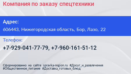 Компания по заказу спецтехники по адресу 606443, Нижегородская область, Бор, Лазо, 22 в дальнейшем Организация, размещена в следующих категориях: