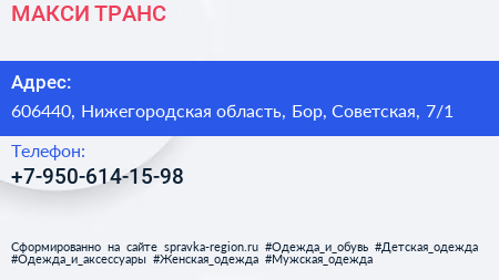МАКСИ-ТРАНС по адресу 606440, Нижегородская область, Бор, Советская, 7/1 в дальнейшем Организация, размещена в следующих категориях: