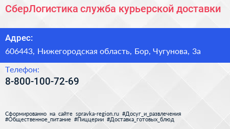 СберЛогистика, служба курьерской доставки по адресу 606443, Нижегородская область, Бор, Чугунова, 3а в дальнейшем Организация, размещена в следующих категориях: