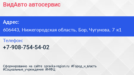 ВидАвто, автосервис по адресу 606443, Нижегородская область, Бор, Чугунова, 7 к1 в дальнейшем Организация, размещена в следующих категориях: