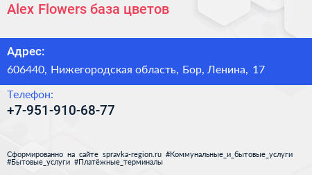 Alex Flowers, база цветов по адресу 606440, Нижегородская область, Бор, Ленина, 17 в дальнейшем Организация, размещена в следующих категориях: