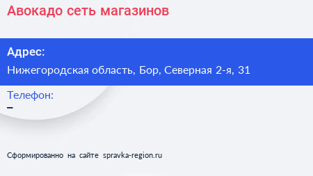 Авокадо, сеть магазинов по адресу Нижегородская область, Бор, Северная 2-я, 31 в дальнейшем Организация, размещена в следующих категориях: