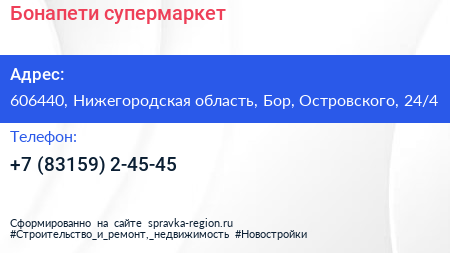 Бонапети, супермаркет по адресу 606440, Нижегородская область, Бор, Островского, 24/4 в дальнейшем Организация, размещена в следующих категориях: