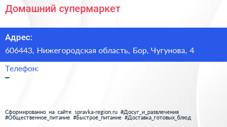 Домашний, супермаркет по адресу 606443, Нижегородская область, Бор, Чугунова, 4 в дальнейшем Организация, размещена в следующих категориях: