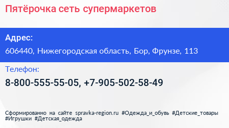 Пятёрочка, сеть супермаркетов по адресу 606440, Нижегородская область, Бор, Фрунзе, 113 в дальнейшем Организация, размещена в следующих категориях: