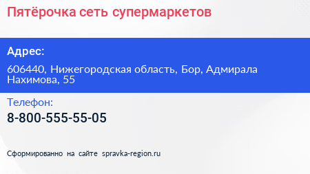 Пятёрочка, сеть супермаркетов по адресу 606440, Нижегородская область, Бор, Адмирала Нахимова, 55 в дальнейшем Организация, размещена в следующих категориях: