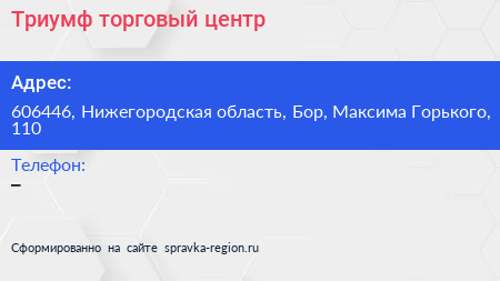 Триумф, торговый центр по адресу 606446, Нижегородская область, Бор, Максима Горького, 110 в дальнейшем Организация, размещена в следующих категориях: