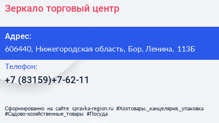 Зеркало, торговый центр по адресу 606440, Нижегородская область, Бор, Ленина, 113Б в дальнейшем Организация, размещена в следующих категориях: