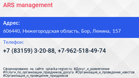 ARS management по адресу 606440, Нижегородская область, Бор, Ленина, 157 в дальнейшем Организация, размещена в следующих категориях: