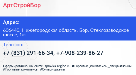 АртСтройБор по адресу 606440, Нижегородская область, Бор, Стеклозаводское шоссе, 1ж в дальнейшем Организация, размещена в следующих категориях: