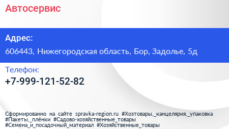 Автосервис по адресу 606443, Нижегородская область, Бор, Задолье, 5д в дальнейшем Организация, размещена в следующих категориях: