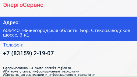 ЭнергоСервис по адресу 606440, Нижегородская область, Бор, Стеклозаводское шоссе, 3 к1 в дальнейшем Организация, размещена в следующих категориях: